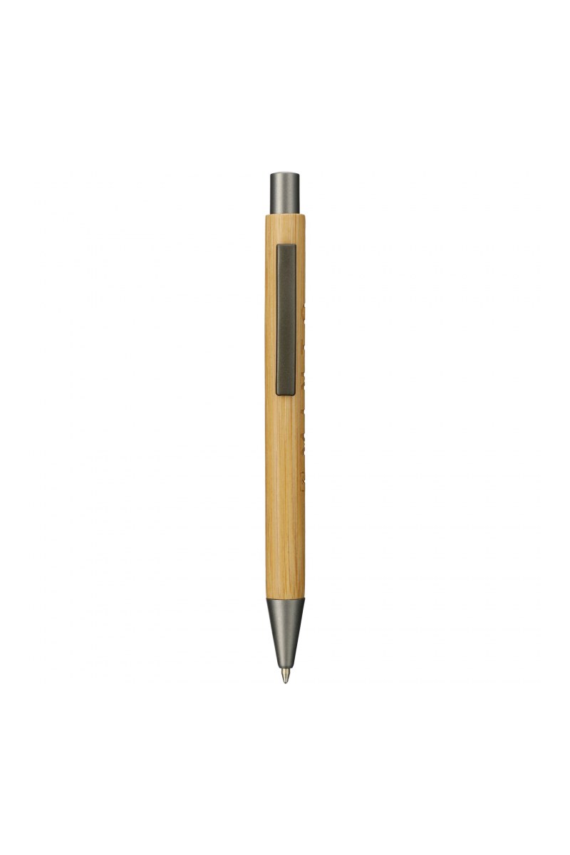 The Bamboo Ballpoint features a 100% bamboo barrel with gunmetal accents. Equipped with ultra-smooth, quick dry semi-gel black ink cartridge. Click action mechanism. Pen tip is 1 mm. Writing length is 800m. Laser finish is light to dark brown wood burned appearance.